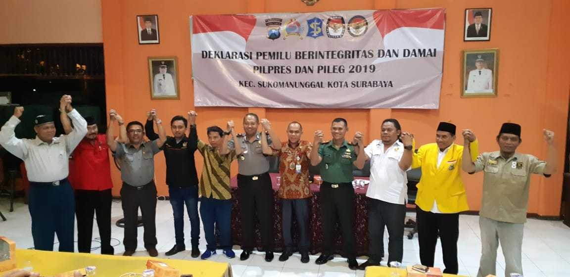 Hupmas, SURABAYA – Bertempat di Aula kantor Kecamatan Sukomanunggal Surabaya, diselenggarakan Deklarasi Pemilu Berintegritas dan Damai, Rabu (03/10/2018). Deklarasi dilakukan oleh Kepolisian Sektor Sukomanunggal bersama Camat, Danramil, Panitia Pemilihan Kecamatan (PPK), Panitia Pengawas Pemilu Kecamatan (Panwascam), Partai Politik Peserta Pemilu se-Sukomanunggal, serta berbagai tokoh agama dan masyarakat.