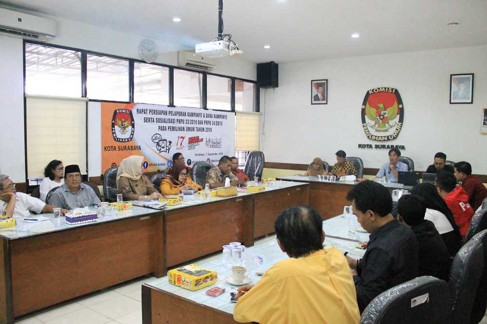 Hupmas, SURABAYA – Jumat siang (07/09/2018), KPU Surabaya mengadakan Rapat Persiapan Pelaporan Kampanye dan Dana Kampanye Serta Sosialisasi Peraturan Komisi Pemilihan Umum (PKPU) Nomor 23 Tahun 2018 dan PKPU Nomor 24 Tahun 2018 Pada Pemilihan Umum Tahun 2019. Rapat yang diadakan di Kantor KPU Surabaya Lantai 1 tersebut dihadiri oleh Petugas Penghubung/Liaison Officer (LO) dari 16 (enam belas) Partai Politik (Parpol) Peserta Pemilu 2019. Acara tersebut dipimpin oleh Ketua KPU Surabaya yang sekaligus merangkap Divisi Hukum, Nur Syamsi. Pemaparan materi pertama disampaikan oleh Ketua yang memaparkan terkait persiapan dana kampanye. Kemudian dilanjutkan secara estafet oleh Divisi SDM dan Partisipasi Masyarakat, Muh. Kholid As yang membahas tentang kampanye. Pria kelahiran Boyolali tersebut menyampaikan akan ada 2 (dua) Alat Peraga Kampanye (APK) yang difasilitasi oleh KPU yakni baliho dan spanduk. “Untuk titik lokasi pemasangan APK tersebut kami akan berkoordinasi dengan Pemerintah Kota,” jelas Kholid. (lay/esar) Materi selengkapnya dapat diunduh dilink berikut ini: Kampanye Pemilu Tahun 2019_Materi Kampanye Tanggal 07 September 2018 dan Persiapan Rakor Kampanye_31 Agustus 2018