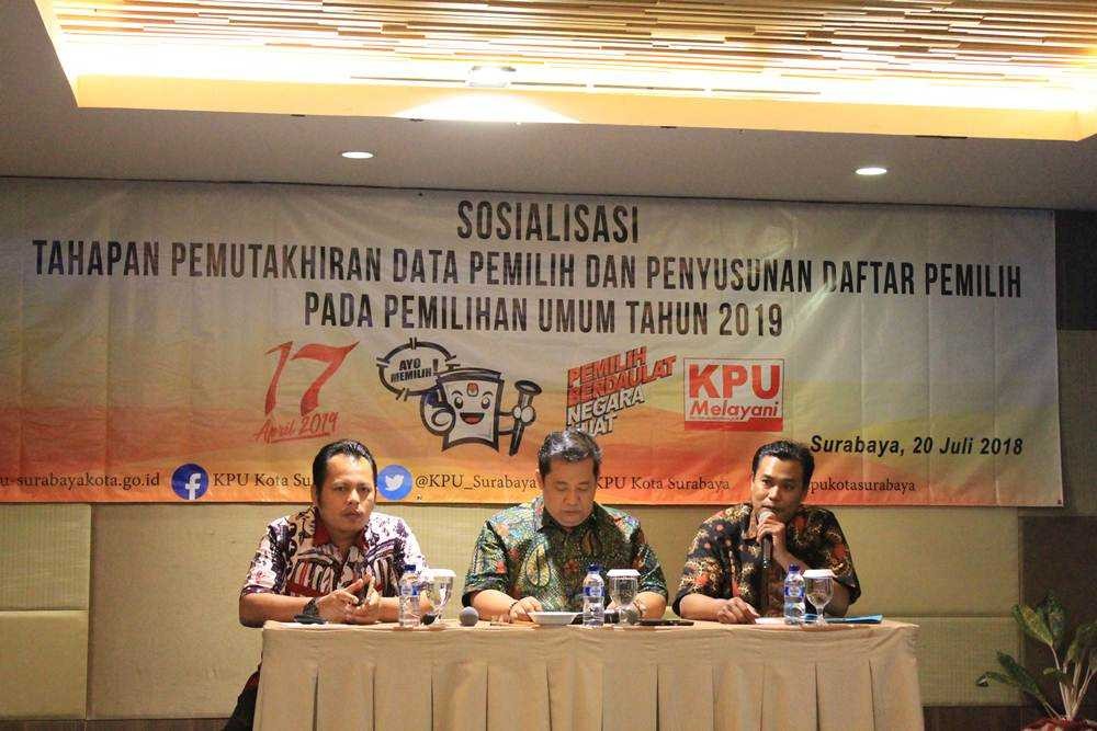 Hupmas, SURABAYA – Bertempat di Hotel Santika Pandegiling Surabaya, KPU Surabaya menggelar Sosialisasi Tahapan Pemutakhiran Data Pemilih dan Penyusunan Daftar Pemilih siang ini (20/07/2018). Yang menjadi peserta undangan yaitu camat, instansi, awak media. Hadir sebagai narasumber adalah anggota KPU Provinsi Jawa Timur yang membidangi Divisi Perencanaan dan Data, Choirul Anam dan Iswan Arief selaku Kasie Sistem Informasi Administrasi Kependudukan dari Dinas Kependudukan dan Catatan Sipil Surabaya. Sementara itu yang bertindak sebagai moderator ialah Divisi Perencanaan dan Data KPU Surabaya, Robiyan Arifin. Sebelumnya pada tanggal 17 Juni 2018 yang lalu sejumlah 2.041.201 pemilih telah ditetapkan sebagai Daftar Pemilih Sementara (DPS) dalam Pemilu Tahun 2019. DPS tersebut merupakan hasil pemutakhiran dari Daftar Pemilih Tetap (DPT) Pilgub 2018 sejumlah 2.006.061 pemilih. Penambahan 35.140 tersebut berasal dari pemilih pemula. Sedangkan pada tanggal 22 Juli 2018 KPU Surabaya akan menetapkan Daftar Pemilih Sementara Hasil Perbaikan (DPSHP) pada Pemilihan Umum Tahun 2019. DPSHP tersebut nantinya akan menjadi bahan untuk penetapan Daftar Pemilih Tetap (DPT) pada bulan Agustus mendatang. (azi/esar)