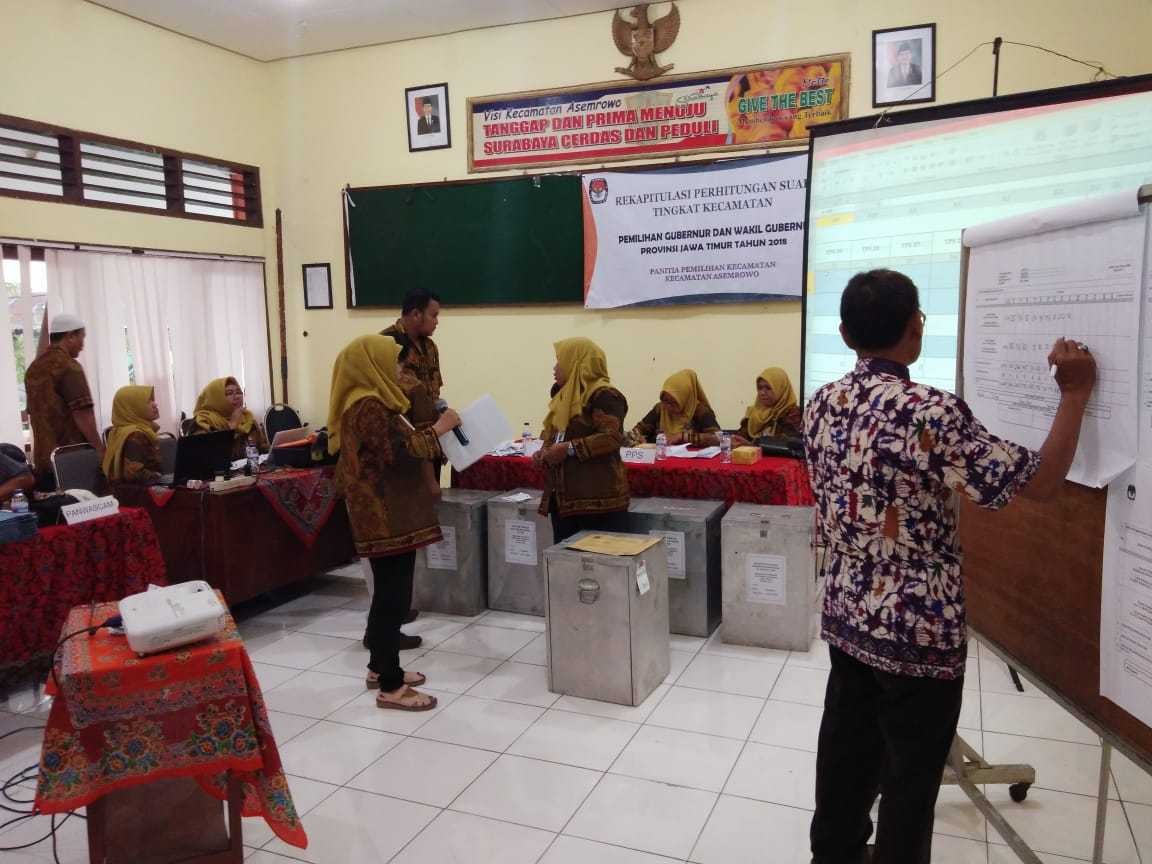 Sementara itu, kecamatan yang telah melakukan rekapitulasi penghitungan suara sampai dengan hari ini (30/06/2018) yaitu Kecamatan Pakal, Sukomanunggal, Sambikerep, Gayungan, Asemrowo, Jambangan, Lakarsantri, Wiyung, Tenggilis Mejoyo, Benowo, Bulak, Tegalsari, Bubutan, Sukolilo, Gubeng, Pabean Cantian, Dukuh Pakis, Rungkut, Mulyorejo, dan Karangpilang. (azi)