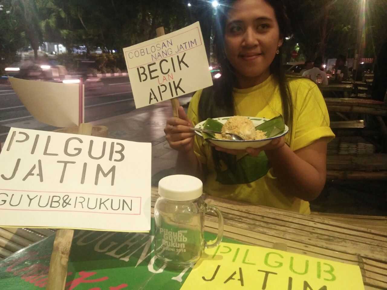 “Pembeli yang datang ke kedai ketan punel usai mencoblos akan kami berikan gratis ketan bubuk kedelai. Syaratnya pembeli mau menunjukkan tinta yang ada di jarinya dan bersedia difoto. Artinya dengan bukti tinta di jarinya, berarti dia sudah mencoblos,” terang pemilik kedai ketan punel, Wahyu Darmawan.