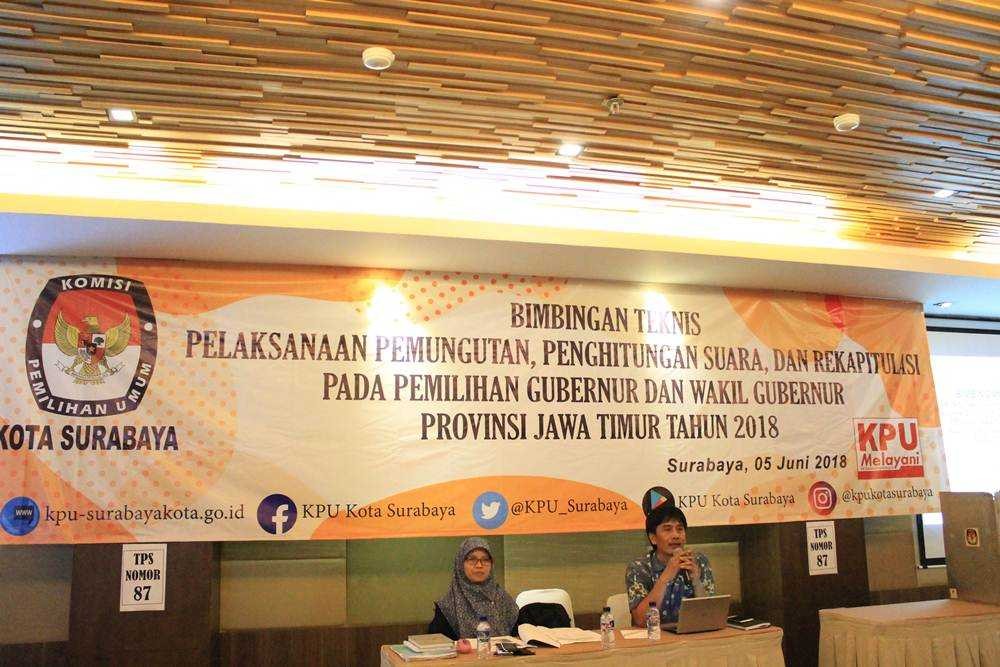 Selasa siang (05/06/2018), KPU Surabaya menyelenggarakan bimbingan teknis yang diikuti oleh Panitia Pemilihan Kecamatan (PPK) dalam rangka persiapan pelaksanaan pemungutan dan penghitungan suara serta proses rekapitulasi pada Pilkada Serentak 2018.