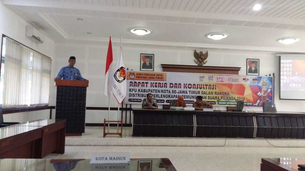 Bertempat di Aula/Ruang Rapat Pemda Kabupaten Kediri, rakor yang dimulai pada pukul 13.00 WIB ini digelar dalam rangka pelaksanaan pengadaan logistik Pilkada Serentak Tahun 2018. Sementara itu, yang bertindak sebagai narasumber ialah Ketua KPU Provinsi Jawa Timur, Eko Sasmito, Anggota KPU Provinsi Jawa Timur yang membidangi Divisi Keuangan, Umum, dan Logistik, Dewita Hayu Shinta, dan Sekretaris KPU Provinsi Jawa Timur, Eberta Kawima. (azi/esar)