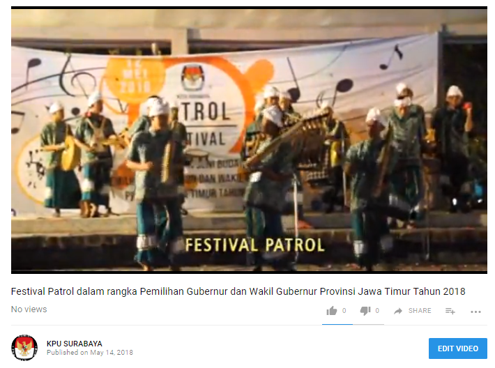 Hupmas, SURABAYA – Dibuka dengan tari remo yang dipersembahkan oleh Panitia Pemilihan Kecamatan (PPK) Asemrowo, festival patrol yang diselenggarakan oleh KPU Surabaya berhasil menjadi daya tarik pengunjung Taman Mundu tempat berlangsungnya acara. Sabtu (12/05/2018), KPU Surabaya menyelenggarakan Pagelaran Seni Budaya dalam rangka mensosialisasikan Pilgub Jatim 2018 yang pelaksanaannya kurang 44 (empat puluh empat) hari lagi. Pagelaran Seni Budaya yang dikemas dengan Festival Patrol tersebut diikuti oleh PPK di wilayah kerja Kota Surabaya. Masing-masing peserta menyajikan suguhan musik patrol dengan membawakan mars atau jingle Pilgub Jatim 2018 yang telah diaransemen secara bervariasi dan beragam. Riuh gemuruh musik patrol yang ditampilkan peserta berhasil menyedot perhatian masyarakat. Hal itu terbukti dengan membludaknya penonton yang memenuhi area Taman Mundu untuk menyaksikan Pagelaran Seni Budaya tersebut. Ketua KPU Surabaya, Nur Syamsi dalam sambutannya di awal acara, menyampaikan bahwa dengan digelarnya Festival Patrol ini selain menjadi hiburan masyarakat pengunjung Taman Mundu juga mensosialisasikan kepada masyarakat akan digelarnya pemungutan suara Pilgub Jatim 2018 pada 27 Juni mendatang dan siapa saja pasangan calon yang akan maju untuk memimpin Jawa Timur lima tahun kedepan. Penampilan peserta disaksikan dan dinilai oleh 3 (tiga) dewan juri. Bertindak sebagai dewan juri ialah Mahmud Suhermono (Persatuan Wartawan Indonesia), Hari Wahyudi (seniman musik), dan Nur Syamsi (Ketua KPU Suarabaya). Penilaian berdasarkan kekompakkan, harmoninasi, kreativitas, pelafalan lirik, dan kerapian yang unsurnya meliputi ketepatan waktu mulai dari persiapan hingga performance. Adapun penampilan peserta yang sukses menarik perhatian juri dan menyabet gelar juara adalah Kecamatan Pakal (juara I), Kecamatan Gayungan (juara II), Kecamatan Lakarsantri (juara III), Kecamatan Tandes (juara harapan I), Kecamatan Asemrowo (juara harapan II), dan Kecamatan Tegalsari (juara harapan III). (azi/esar)
