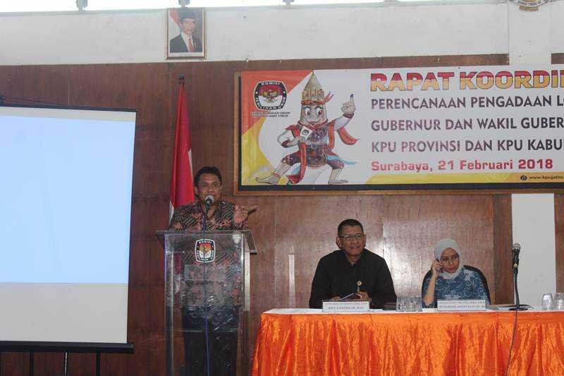 Hupmas, SURABAYA – Rabu siang (21/02/2018), dihadiri oleh Ketua, Kepala Sub Bagian Keuangan, Umum, dan Logistik, Sekretaris serta Ketua Pejabat Pengadaan dari 38 KPU Kabupaten/ Kota se-Jawa Timur, KPU Provinsi Jawa Timur menggelar Rapat Koordinasi (Rakor) Perencanaan Pengadaan Logistik Pemilihan Gubernur dan Wakil Gubernur Provinsi Jawa Timur Tahun 2018.