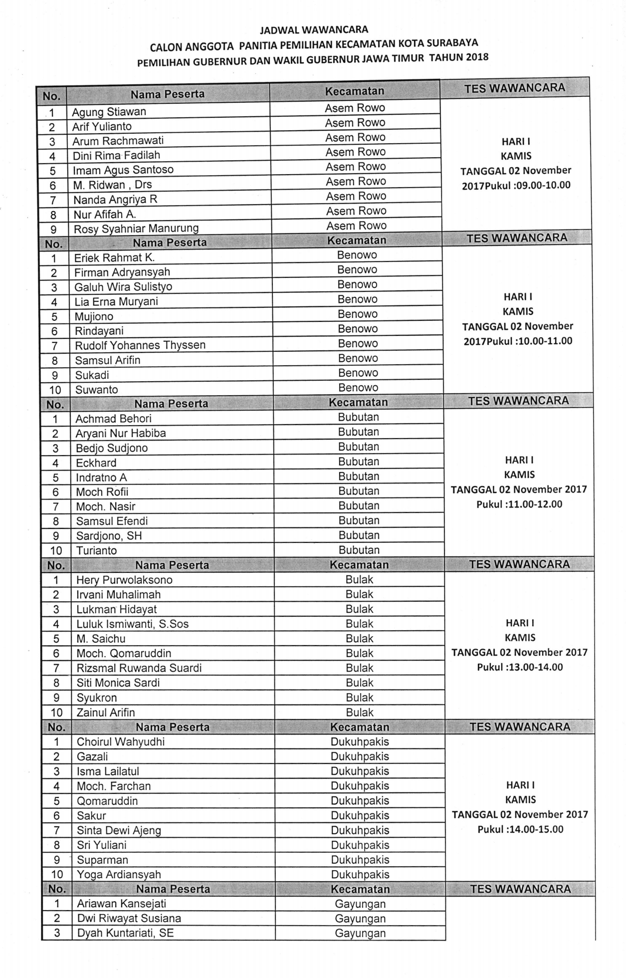“Dari hasil seleksi tes tulis ini nantinya diambil 10 besar calon anggota PPK untuk mengikuti tes wawancara pada tanggal 02 – 04 November 2017. Selanjutnya, akan dipilih lima orang di masing-masing kecamatan,” jelas Ketua KPU Surabaya, Nur Syamsi.