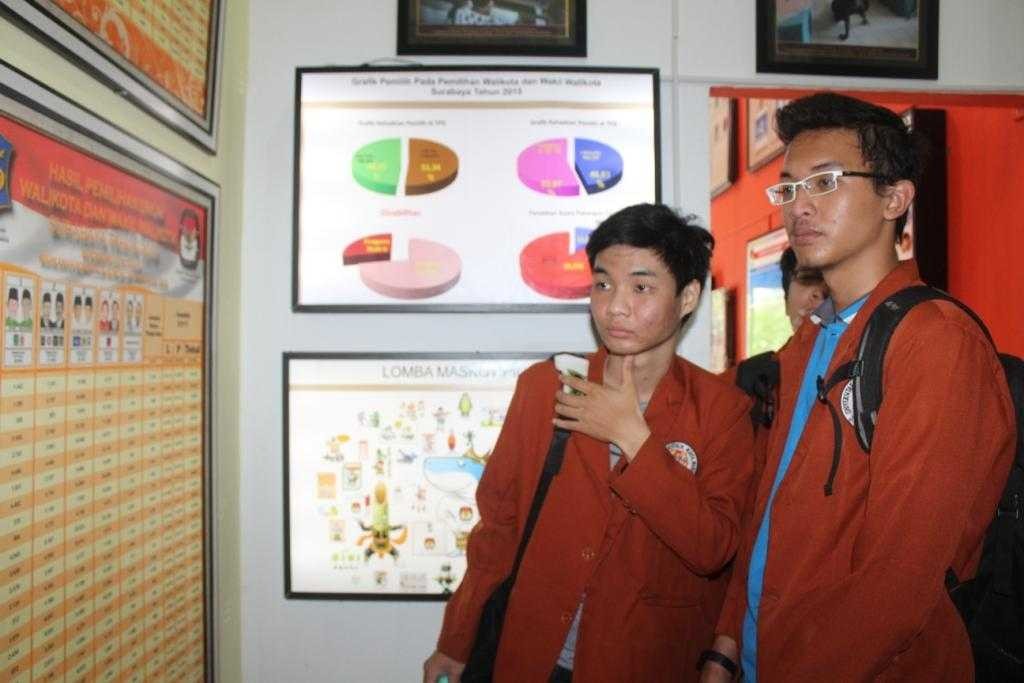 Hupmas, Surabaya-Lima anak muda berjas almamater Universitas Katolik Widya Mandala (UKWM) Surabaya, Rabu pagi (19/07/2017) datangi kantor KPU Surabaya untuk melakukan observasi, wawancara sekaligus mengikuti diskusi Reboan bersama jajaran Sekretariat KPU Surabaya. Sembari menunggu dimulainya diskusi yang dijadwalkan dimulai pada pukul 10.30 WIB, Vicentius Setiadi, P.I. Samuel A, Wicaksono P., Izza Fauzia dan Putri Yulga Sari melakukan kunjungan ke RPP Bung Tomo yang letaknya digedung sebelah kantor KPU Kota Surabaya. Dengan didampingi oleh Kepala Sub Bagian Teknis dan Hupmas, Endang Sri Arti Rahayu yang turun langsung menjadi tour guide RPP Bung Tomo, Kelimanya diajak berkeliling disetiap sudut RPP Bung Tomo. Endang menjelaskan bahwa sejak di launching tanggal 18 April 2017, RPP ini telah dikunjungi tidak hanya oleh pelajar, namun juga mahasiswa dan masyarakat umum. RPP Bung Tomo ini memang didesain sebagai wadah untuk edukasi demokrasi dan kepemiluan sertan terbuka untuk semua kalangan masyarakat. Selain dilengkapi dengan ruang audio visual dan perpustakaan, RPP Bung Tomo juga dilengkapi dengan ruang simulasi TPS. “RPP ini buka dari hari Senin sampai Jum’at. Jam buka menyesuaikan dengan jam kerja. Senin–Kamis Pukul 08.00-16.00, sedangkan hari Jum’at Pukul 08.00-16.30 WIB,” jelasnya. “Tempat ini full data kepemiluan ceritanya ya, ada sejarah pemilu 1955 juga. Bagus ini kalau untuk para pelajar dan mahasiswa. Perpaduan antara penyajian data-data, gambar-gambar atau alat peraga, dan bahkan miniatur seperti TPS sangat menarik. Ada tablet untuk bermain games lagi,”ungkap Samuel, salah satu mahasiswa. Kelima mahasiswa ini pun sangat mengapresiasi kerja KPU, dimana lahirnya rumah pintar pemilu telah memberikan warna tersendiri untuk mengajarkan tentang arti pentingnya Pemilu. Mereka berharap dengan adanya rumah pintar pemilu mampu mendorong masyarakat Surabaya menjadi pintar dalam berdemokrasi sehingga proses demokrasi di Surabaya ini jauh dari tendensi money politik. (cha)