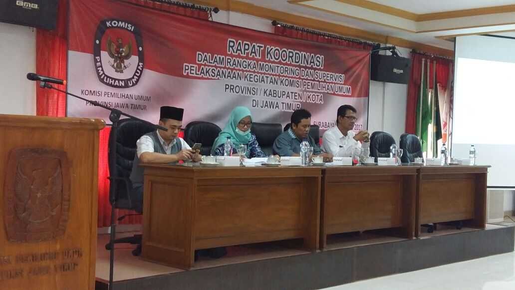 Hupmas, SURABAYA-KPU Provinsi Jawa Timur, Kamis (09/03/2017), mengadakan Rapat Koordinasi (Rakor) untuk monitoring dan supervisi Rencana Kebutuhan Biaya (RKB) dengan mengundang Ketua dan Divisi Umum; Keuangan dan Logistik 18 KPU Kabupaten/ Kota yang melaksanakan Pemilihan Kepala Daerah (Pilkada) Tahun 2018, serta Sekretaris dari 38 KPU Kabupaten/ Kota se Jawa Timur.
