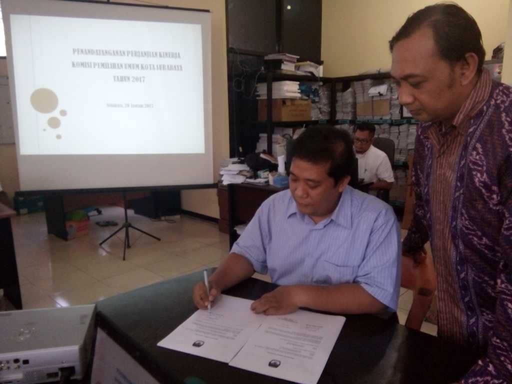 Hupmas, KPU SURABAYA- Menindaklanjuti Surat KPU RI Nomor 698/KPU/XII/2016 tanggal 29 Desember 2016 perihal Penyampaian Perjanjian Kinerja Tahun 2017 dan Laporan Kinerja Tahun 2016 yang diteruskan dengan Surat Ketua KPU Provinsi Jawa Timur Nomor 01/KPU-Prov-014/I/2017 tanggal 4 Januari 2017, KPU Kota Surabaya telah menggelar rapat penyusunan Perjanjian Kinerja dan Laporan Kinerja dimaksud. sekaligus penandatanganan, Jumat (20/01/2017). Perjanjian Kinerja (PK) tersebut ditandatangani langsung oleh Ketua KPU Kota Surabaya, Robiyan Arifin dan Sekretaris KPU Kota Surabaya, Sunarno Aristono. Anggota KPU Surabaya Divisi Teknis, Nurul Amalia sesuai acara penandatangan Perjanjian Kinerja (PK) KPU Surabaya Tahun 2017 menyampaikan harapannya. “Mudah-mudahan dengan telah ditandatanganinya Perjanjian Kinerja ini, komitmen KPU Kota Surabaya untuk mewujudkan manajemen kelembagaan transparan dan akuntabel dapat dilaksanakan, ” ungkap Nurul. Perjanjian Kinerja, lanjut Nurul, merupakan alat ukur bagi kinerja KPU Kota Surabaya. Perjanjian kinerja menjadi pedoman bagi KPU Surabaya dalam melaksanakan kegiatan di Tahun 2017. ”Apalagi di tahun 2017 ada persiapan Pilgub. Target partisipasi pemilih Pilgub 2018 harus diatas Pilgub 2016. Demikian pula dengan pemilih yang tidak terdaftar di DPT harus lebih rendah dibanding Pilwali Surabaya Tahun 2015,” ungkap alumnus Universitas Airlangga Surabaya tersebut Nurul menambahkan, di akhir tahun, apa yang dilaksanakan di Tahun 2017 akan disandingkan dengan Perjanjian Kinerja. ”Apakah sudah sesuai atau belum. Ini menjadi bentuk akuntabilitas KPU Kota Surabaya,” pungkas Alumni FMIPA Universitas Airlangga Surabaya tersebut