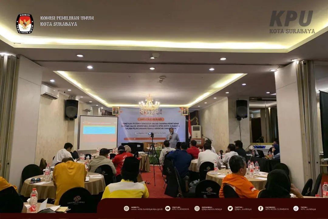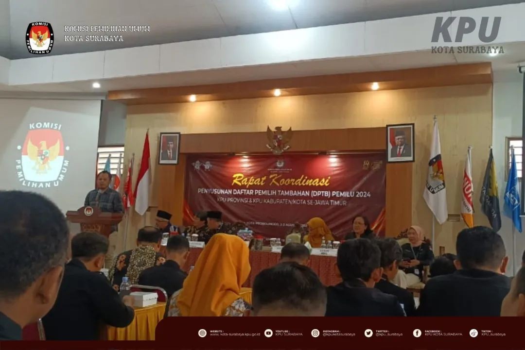 Surabaya, http://kota-surabaya.kpu.go.id - Jumat (4/8), KPU Surabaya menyelenggarakan Rapat Koordinasi Daftar Pemilih Tambahan (DPTb) dan Pengelolaan Logistik Pemilu Serentak Tahun 2024 di Graha Swara KPI Surabaya. Kegiatan yang digelar sore hari ini dihadiri oleh Bawaslu Surabaya, Bakesbangpol Surabaya, Bagian Administrasi Pemerintahan dan Otonomi Daerah Surabaya, serta anggora PPK Divisi Perencanaan, Data, dan Informasi.