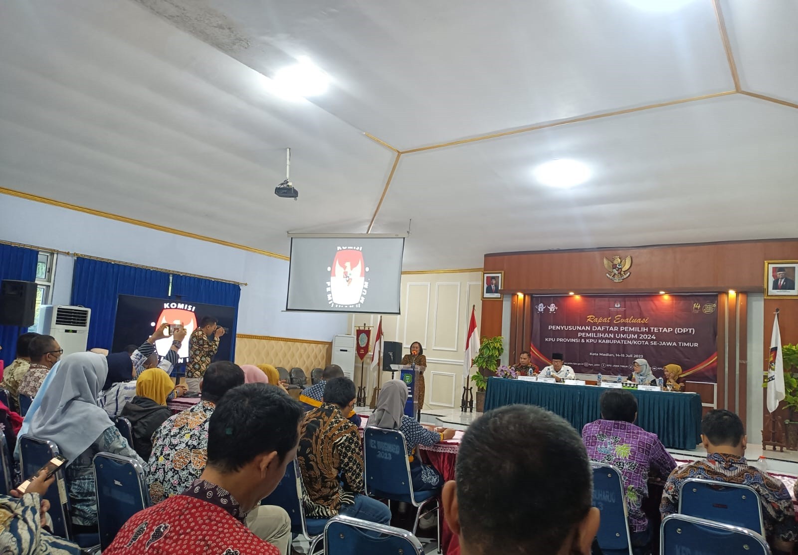 Surabaya, http://kota-surabaya.kpu.go.id - Sabtu (15/7) KPU Surabaya menghadiri Rapat Evaluasi Penyusunan Daftar Pemilih Tetap (DPT) Pemilu 2024 yang digelar oleh KPU Jawa Timur di di Aula Kecamatan Mangunharjo, Kota Madiun. Kegiatan yang berlangsung sejak kemarin (14/7) ini dihadiri oleh Anggota Divisi Perencanaan, Data dan Informasi, Kasubbag Perencanaan, Data dan Informasi, serta Operator Sistem Informasi Data Pemilih (Sidalih) KPU Kabupaten/Kota. Anggota KPU Jawa Timur, Rochani menyampaikan bahwa kegiatan ini sangat penting untuk mengevaluasi terhadap hal-hal yang sudah dilalui dalam tahapan sebelumnya serta menambah pengetahuan melalui kegiatan bedah buku. "Pergerakan data sampai penetapan DPT perlu didokumtasikan dengan baik melalui video sehingga tergambarkan sudut pandang dan cerita dari berbagai KPU Kabupaten/Kota,' harap Rochani. Selanjutnya Anggota KPU Jawa Timur lainnya, Nurul Amalia menyampaikan bahwa evaluasi bertujuan untuk memperbaiki pelayanan data pemilih ke depan dan juga dapat dilakukan berbagai kajian, terutama dikaitkan dengan kebutuhan logistik. Selain itu, Peserta Pemilu dan pihak eksternal harus mengetahui lokasi Tempat Pemungutan Suara (TPS). Anggota KPU Jawa Timur, Gogot Cahyo Baskoro menambahkan bahwa Divisi Perencanaan, Data dan Informasi perlu bekerjasama dengan Divisi Sosialisasi, Pendidilkan Pemilih, Partisipasi Masyarakat dan SDM untuk menyajikan informasi data pemilih dengan menarik.