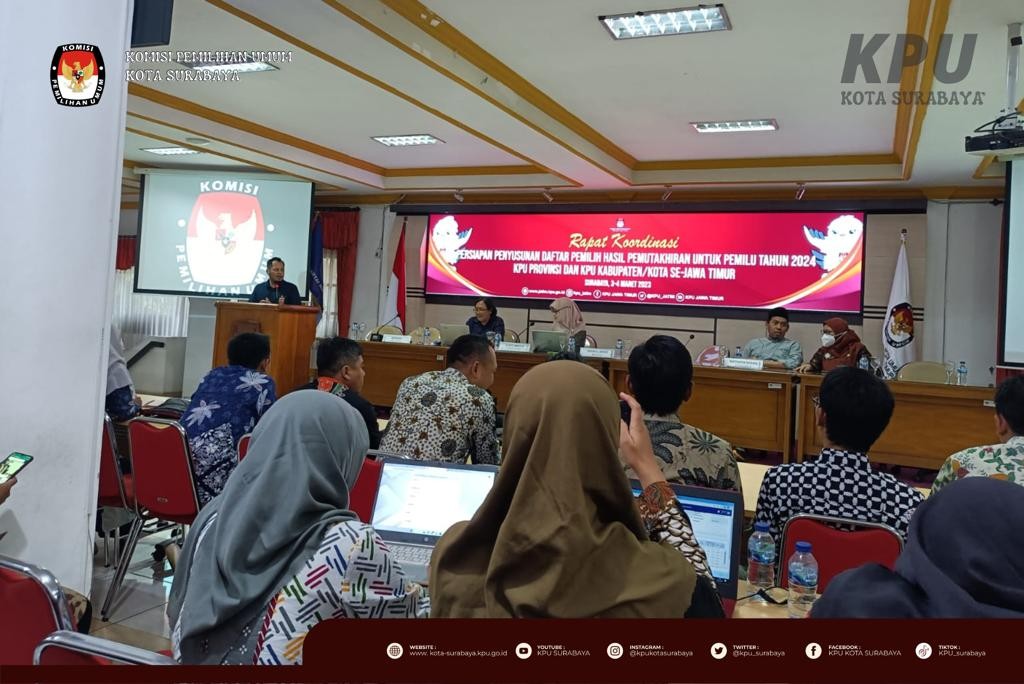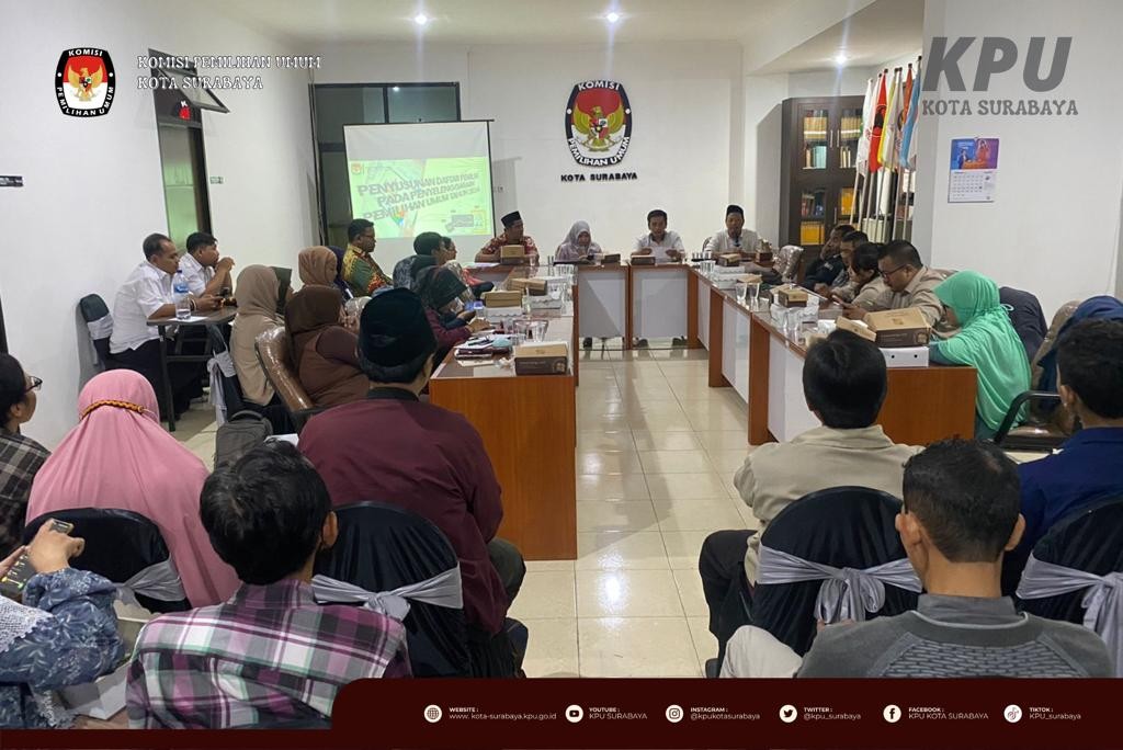 Surabaya, kota-surabaya.kpu.go.id - Senin (7/3), KPU Surabaya melangsungkan rapat koordinasi persiapan penyusunan daftar pemilih hasil pemutakhiran untuk Pemilu 2024. Kegiatan yang berlangsung sekitar 3 jam ini diikuti oleh Ketua dan Anggota Panitia Pemilihan Kecamatan (PPK) Divisi Perencanaan, Data, dan Informasi, serta Bawaslu Surabaya.