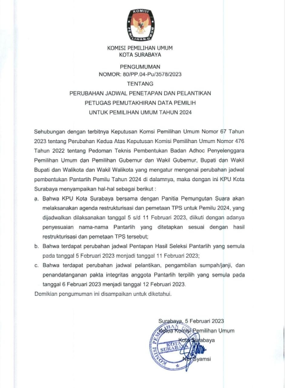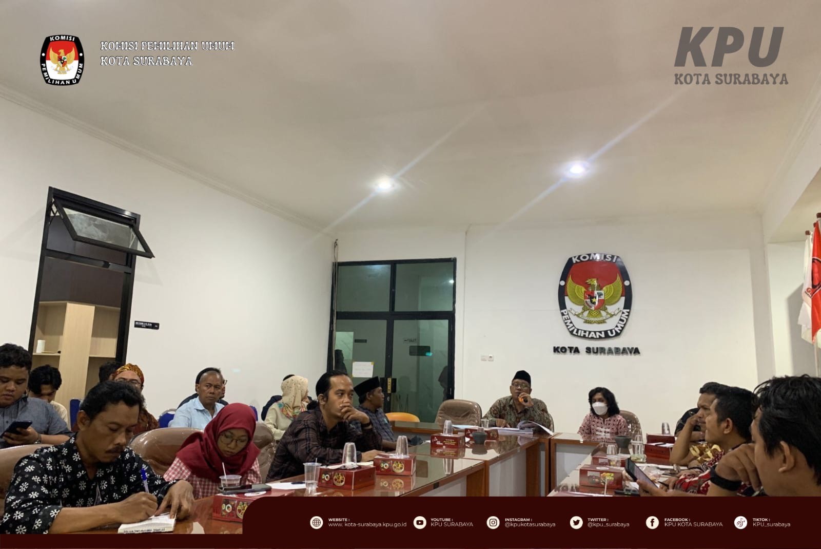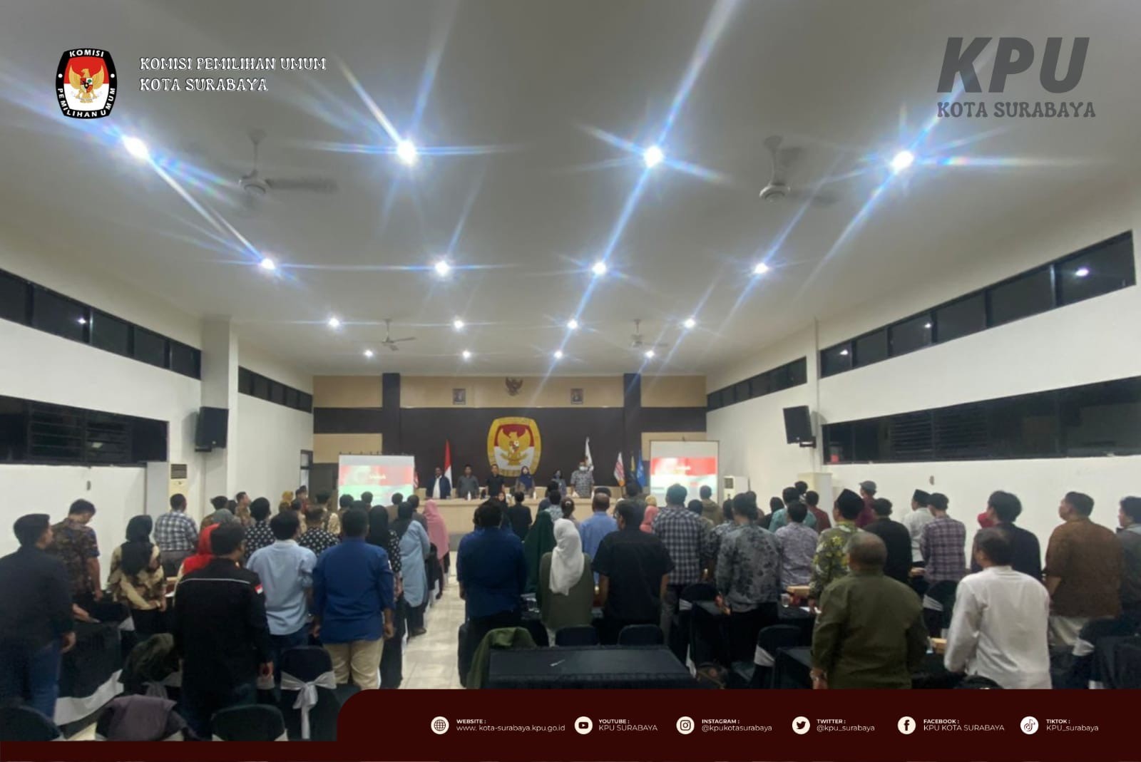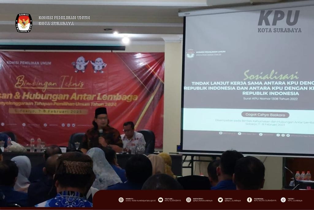 Sidoarjo, kota-surabaya.kpu.go.id - Selasa (7/2), KPU Surabaya menghadiri Bimbingan Teknis (Bimtek) Kehumasan & Hubungan Antar Lembaga dalam Penyelenggaraan Tahapan Pemilu Tahun 2024. Ketua, Anggota Divisi Sosialisasi, Pendidikan Pemilih, Partisipasi Masyarakat, dan Sumber Daya Manusia, serta Kasubbag Teknis Penyelenggaraan Pemilu, Partisipasi, dan Hubungan Masyarakat KPU Kabupaten/Kota se-Jawa Timur. Ketua KPU Jawa Timur, Choirul Anam dalam sambutan pembukanya menyampaikan bahwa KPU Kabupaten/Kota harus siap menghadapi dinamika dalam penyelenggaraan Pemilu, dan mengikuti arahan KPU RI. Choirul Anam juga berpesan agar KPU Kabupaten/Kota perlu menyelenggarakan berbagai tahapan Pemilu yang sedang berjalan dengan efisien dan rasional, mulai pemetaan Tempat Pemungutan Suara (TPS), pemutakhiran data pemilih, dan verifikasi faktual calon perseorangan anggota DPD. "Berbagai kegiatan kepemiluan dapat membangun citra positif kelembagaan melalui kehumasan yang baik," pungkas Choirul Anam Berikutnya Anggota KPU Jawa Timur, Gogot Cahyo Baskoro menyampaikan materi mengenai tindak lanjut yang dilakukan KPU Kabupaten/Kota terhadap MoU yang telah ditetapkan KPU RI, antara lain MoU bersama perguruan tinggi yang akan ditetapkan perguruan tinggi. "Tindaklanjuti MoU KPU RI melalui audiensi, juga perjanjian kerjasama," ujar Gogot Cahyo Baskoro.