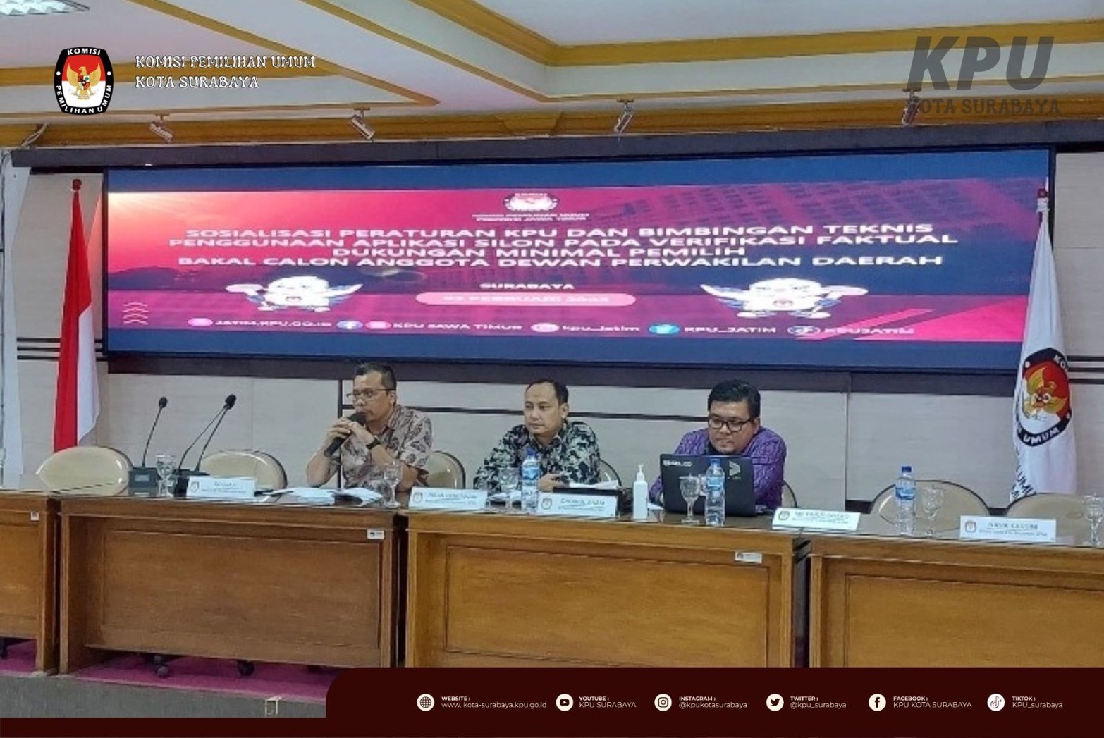 Surabaya, kota-surabaya.kpu.go.id – Jumat (3/2), hari kedua Rapat Koordinasi Persiapan Rekapitulasi Dukungan Pemilih Perbaikan Kesatu dilanjutkan dengan Bimbingan Teknis (Bimtek) Verifikasi Faktual Pencalonan Perseorangan Anggota Dewan Perwakilan Daerah (DPD). Divisi Teknis Penyelenggaraan, Kasubbag Teknis Penyelenggaraan Pemilu, Partisipasi dan Hubungan Masyarakat, serta Operator Silon KPU Kabupaten/Kota se-Jawa Timur menghadiri kegiatan bimtek.