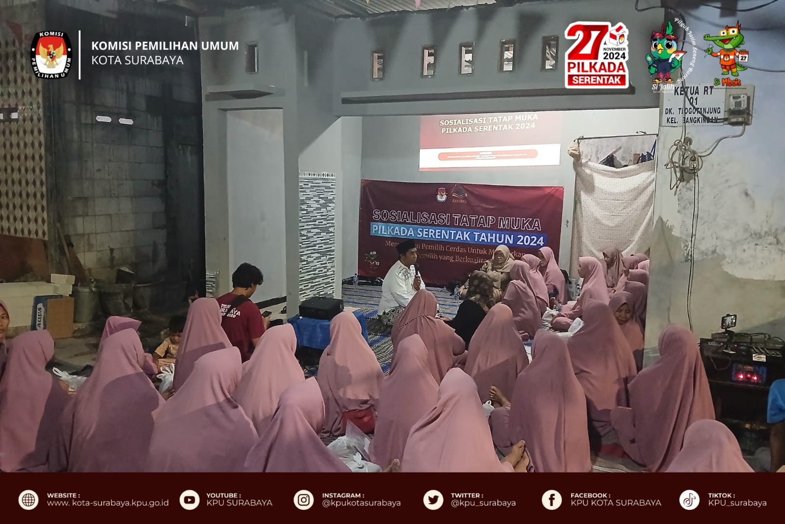 KPU Surabaya - KPU Surabaya mengadakan Kegiatan dalam rangka meningkatkan partisipasi pemilih dan memastikan terselenggaranya pemilihan yang berkualitas pada Pilkada 2024, Komisi Pemilihan Umum (KPU) Kota Surabaya menyelenggarakan sosialisasi tatap muka dengan tema "Pemilih Cerdas, Pemimpin Berkualitas". Acara ini berlangsung Dk Tlogo Tanjung, Bangkingan, Lakarsantri, Surabaya. Kamis, 22 Agustus 2024. Dalam sambutannya, Subairi, Komisioner KPU Kota Surabaya menekankan pentingnya peran aktif masyarakat dalam menentukan pemimpin yang berkualitas. "Saya menyampaikan bahwa pentingnya dating ke TPS karena dengan ini kita dapat menetukan pemimpin dan nasib kita 5 tahun kedepan" ujar Subairi. Sosialisasi ini bertujuan untuk memberikan pemahaman mendalam kepada masyarakat mengenai tata cara pemilihan wali kota dan wakil wali kota yang akan datang, serta mengajak mereka untuk berpartisipasi secara aktif dan bijak dalam menggunakan hak pilih. Diskusi yang berlangsung interaktif juga menjadi ajang bagi peserta untuk bertanya langsung kepada pihak KPU mengenai berbagai hal terkait Pilkada 2024. Para jurnalis yang hadir juga berperan dalam menyebarluaskan informasi penting kepada publik melalui berbagai platform media, sehingga pesan mengenai pentingnya menjadi pemilih yang cerdas dapat tersebar lebih luas. “Kami menghimbau agar setiap informasi atau berita yang diterima tidak langsung dipercaya tanpa verifikasi terlebih dahulu” ujar Novasari. “Sebagai Perempuan, kita memiliki peran yang sangat penting dalam menentukan arah kebijakan dan pemerintahan melalui partisipasi aktif dalam Pemilihan Kepala Daerah 2024 mendatang. Oleh karena itu kita harus berperan aktif dalam menyukseskan pelaksanaan pilkada tersebut” ujar Siti Lailatus, Perwakilan Akademisi. Sosialisasi ini juga diharapkan mampu mendorong kesadaran masyarakat untuk lebih kritis dalam memilih pemimpin yang mampu membawa Surabaya menuju masa depan yang lebih baik.(KPU Sby Rm dkk)