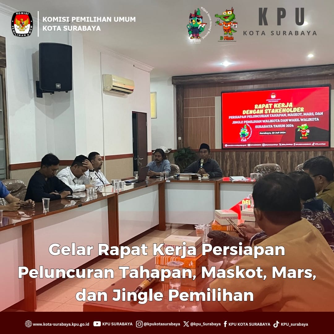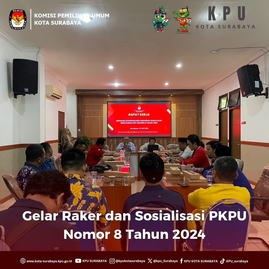 Surabaya, https://kota-surabaya.kpu.go.id - Jum'at (12/7), KPU Surabaya menggelar Rapat Kerja dalam rangka Sosialisasi Peraturan KPU Nomor 8 Tahun 2024 di kantor KPU Surabaya. Kegiatan yang berlangsung siang hingga sore hari ini mengundang Partai Politik dan instansi pemerintahan, seperti Pemerintah Daerah, Pengadilan Negeri, hingga Kepolisian.