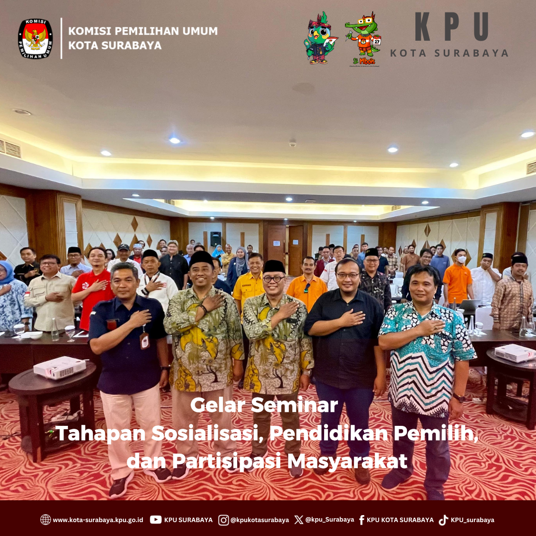 Surabaya, https://kota-surabaya.kpu.go.id - Selasa (9/7), KPU Surabaya menggelar kegiatan Seminar Tahapan Sosialisasi, Pendidikan Pemilih, dan Partisipasi Masyarakat dalam Pemilihan Walikota dan Wakil Walikota Surabaya Tahun 2024 di Hotel Santika Premier Gubeng Surabaya. Kegiatan yang berlangsung selama 5 jam ini dihadiri oleh Partai Politik, instansi pemerintahan, organisasi masyarakat, keagamaan, kepemudaan, dan disabilitas, hingga BEM Perguruan Tinggi di Surabaya.