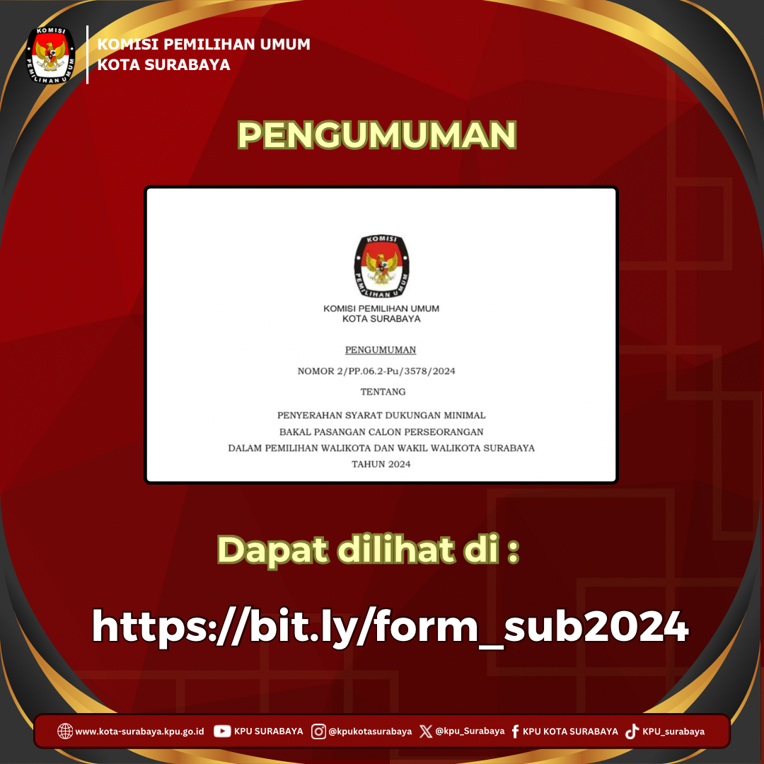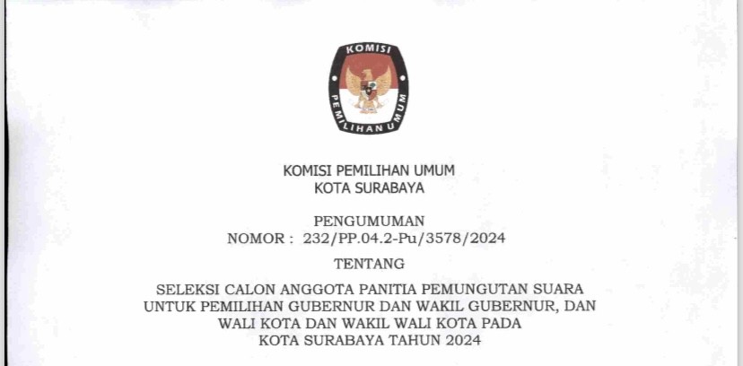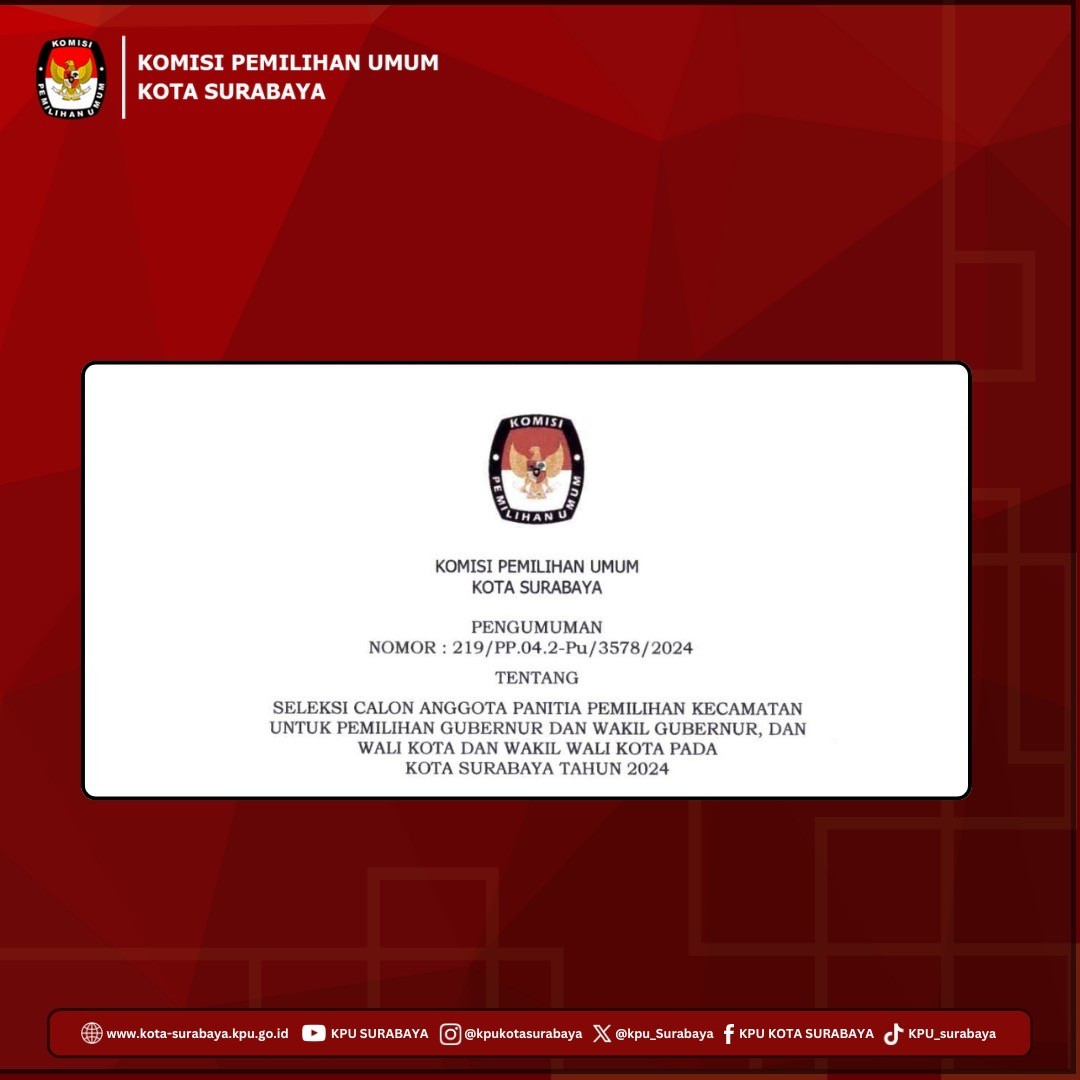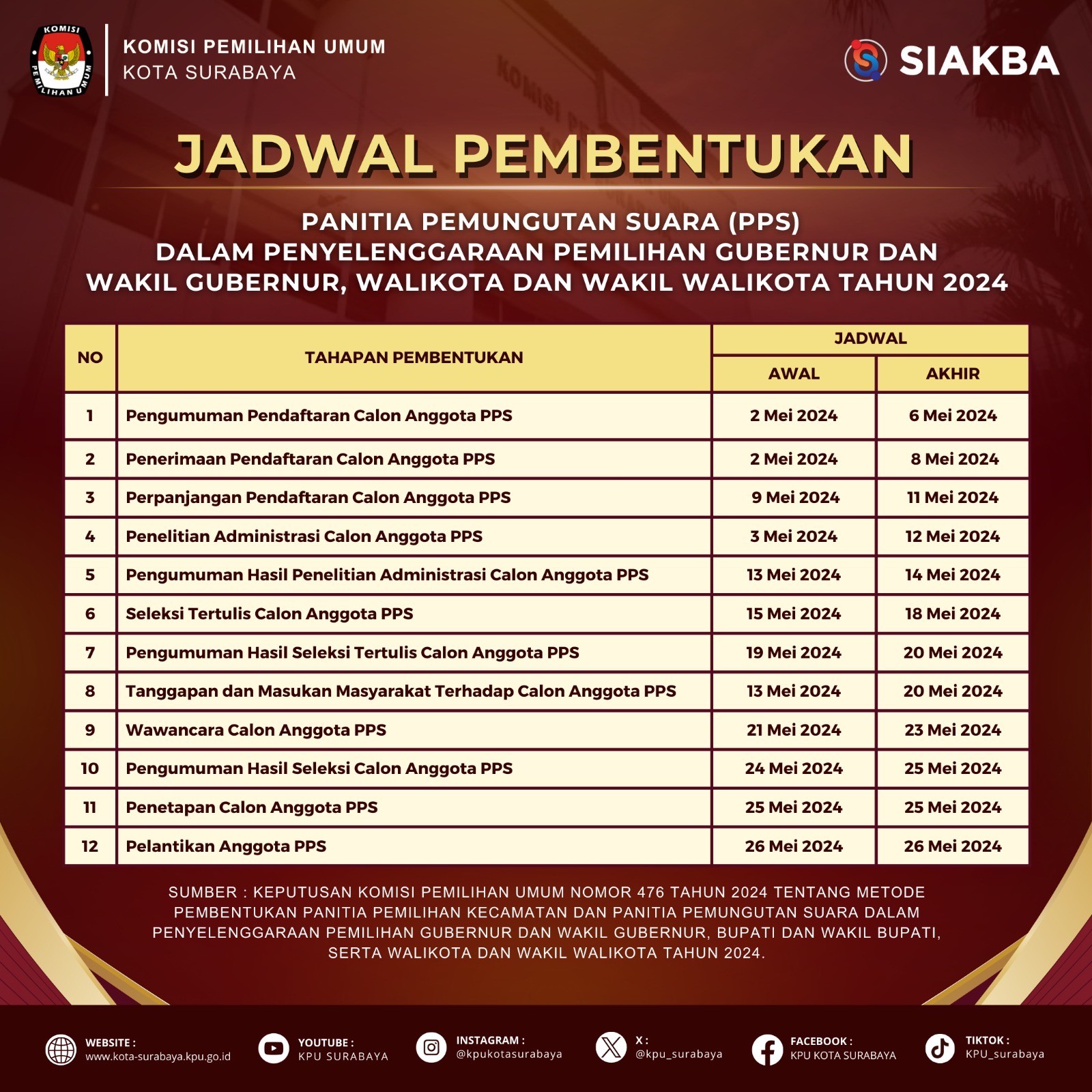 Hai #temanpemilih Seleksi Calon Anggota Panitia Pemungutan Suara Untuk Pemilihan Gubernur dan Wakil Gubernur, dan Wali Kota dan wakil Wali Kota pada Kota Surabaya Tahun 2024, Kamis s.d Rabu, 2 s.d 8 Mei 2024 jam 08.00 - 15.00 WIB, informasi selengkapnya dapat diunduh pada tautan berikut : https://bit.ly/pps_pilkadasub