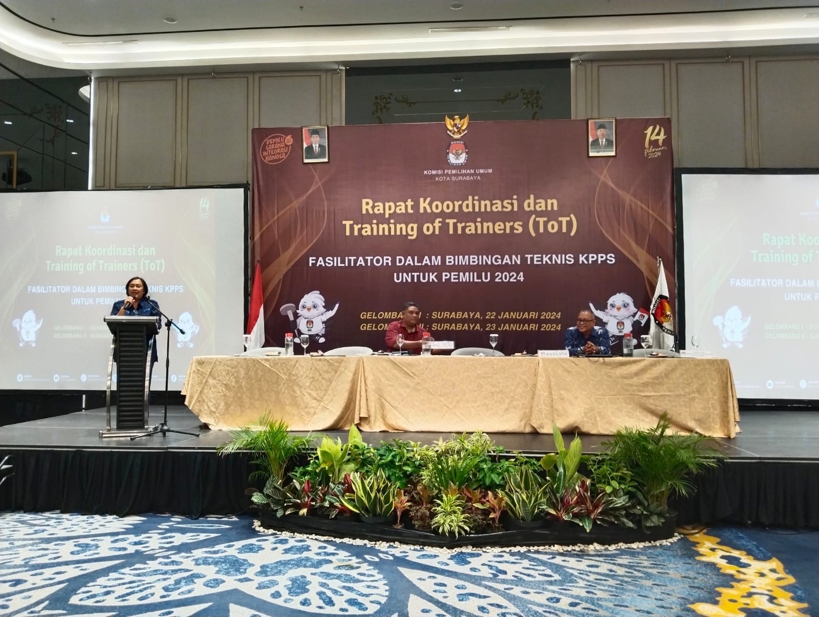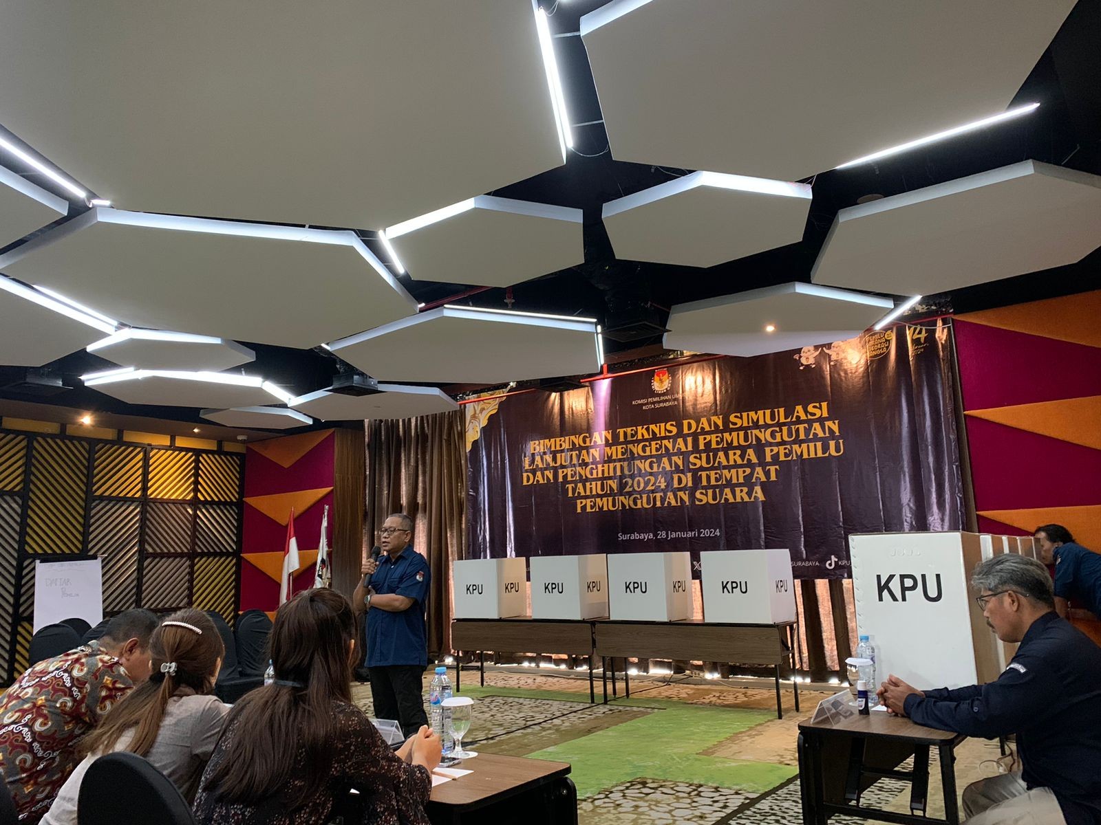 Surabaya, https://kota-surabaya.kpu.go.id - Minggu (28/1), KPU Surabaya menggelar Bimbingan Teknis dan Simulasi Lanjutan Mengenai Pemungutan dan Perhitungan Suara Pemilu Tahun 2024 di Tempat Pemungutan Suara. Kegiatan yang dihadiri oleh Partai Politik Peserta Pemilu Tahun 2024, Anggota Panitia Pemilihan Kecamatan (PPK) dan Panitia Pemungutan Suara (PPS) serta jurnalis dan media. Anggota KPU Surabaya, Soeprayitno mengatakan bahwa sebelumnya bimbingan teknis serta simulasi pemungutan dan penghitungan suara pernah digelar pada Desember tahun lalu yang mana melibatkan hampir 200 pemilih riil yang berasal dari masyarakat sekitar kantor KPU Surabaya. "Bimtek dan pungut hitung kali ini melibatkan teman-teman PPK, PPS, dan parpol se-Surabaya dalam rangka memberi gambaran riil UU Nomor 7 Tahun 2017. Serta pedoman teknis, yaitu Keputusan KPU RI Nomor 66 Tahun 2024 tentang pedoman teknis pemungutan dan penghitungan suara pada pemilu tahun 2024," kata Soeprayitno. Soeprayitno menambahkan bahwa form C pendamping juga disiapkan, di mana pendamping harus mengisi formulir tersebut, pun demikian pemilih yang dibantu dalam penulisannya. Artinya pendamping pun ditekankan dalam formulir atau perjanjian tertulis, bahwa pendamping wajib dan sanggup menjaga kerahasiaan apa yang dipilih oleh pemilih yang didampingi.
