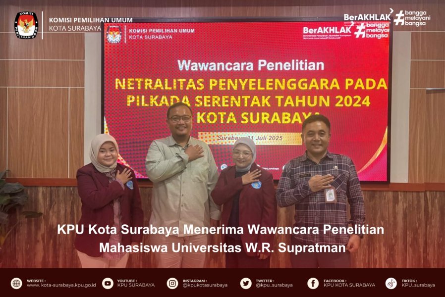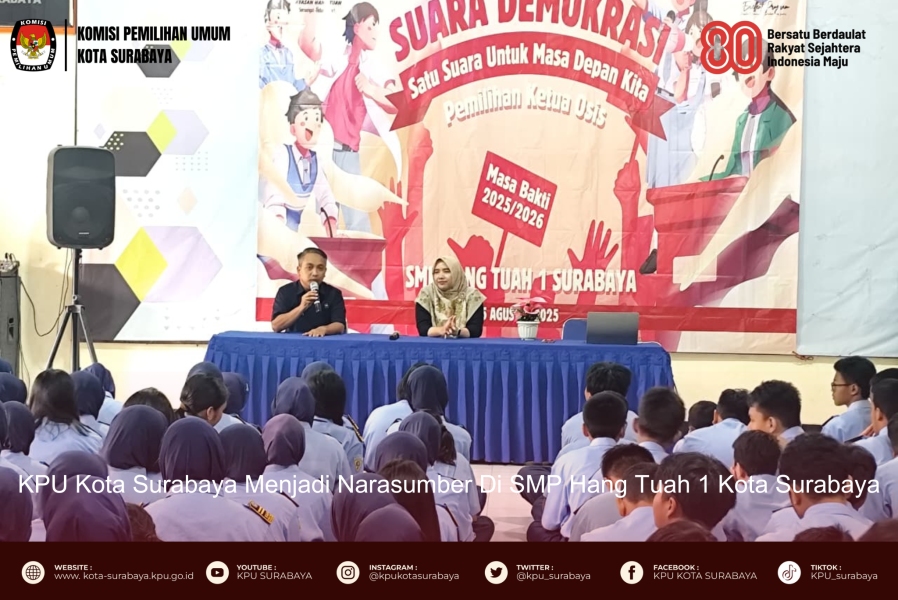 KPUSBY- Komisi Pemilihan Umum (KPU) Kota Surabaya menghadiri undangan dari SMP Hang Tuah 1 Kota Surabaya dalam rangka kegiatan Projek Penguatan Profil Pelajar Pancasila (P5) Tahun Ajaran 2025–2026. Kegiatan ini dilaksanakan pada Selasa, 5 Agustus 2025 pukul 08.00 WIB, bertempat di Aula SMP Hang Tuah 1 Kota Surabaya. Kepala Sekolah SMP Hang Tuah 1 Kota Surabaya, Soni Indrawanto, M.Pd, dalam sambutannya menyampaikan bahwa demokrasi merupakan bagian penting dari nilai-nilai Pancasila yang perlu ditanamkan sejak dini. Ia menegaskan bahwa praktik demokrasi dapat dimulai dari lingkup kecil, termasuk di lingkungan sekolah. “Pada bulan ini, kami akan mengadakan pemilihan Ketua OSIS. Harapannya, siswa dapat memahami materi hari ini dan menerapkannya langsung dalam proses pemilihan nanti,” ujarnya. Sebagai narasumber dalam kegiatan tersebut, hadir Anggota KPU Kota Surabaya Divisi Perencanaan, Data dan Informasi, Naafilah Astri Swarist, yang memberikan materi edukatif tentang demokrasi dan penyelenggaraan pemilihan. Dalam pemaparannya, Naafilah menyampaikan bahwa dalam sebuah pemilihan, terdapat beberapa unsur penting yaitu penyelenggara, pemilih, dan peserta atau calon. Unsur ini tidak hanya berlaku dalam pemilu nasional, tetapi juga dalam pemilihan di sekolah, seperti pemilihan Ketua OSIS. Selain itu, pemilihan juga harus berdasarkan asas Langsung, Umum, Bebas, Rahasia, Jujur, dan Adil atau biasa disingkat dengan Luber dan Jurdil. Asas ini dapat diterapkan dalam pemilihan OSIS agar prosesnya demokratis dan transparan. Naafilah juga memberikan masukan dalam rangka mendukung kelancaran pelaksanaan pemilihan Ketua OSIS dengan membuat SOP pemilihan, seperti membentuk panitia penyelenggara, menetapkan pengawas, serta menyiapkan kelengkapan Tempat Pemungutan Suara (TPS). Selain menyampaikan materi, Naafilah juga mengajak para siswa untuk aktif mencari informasi dan meningkatkan literasi tentang kepemiluan, agar para siswa memiliki kesadaran berdemokrasi yang baik sejak dini. Kegiatan ini mendapat sambutan hangat dari para siswa dan guru, serta diharapkan menjadi langkah awal dalam membangun generasi muda yang memahami dan menerapkan nilai-nilai demokrasi dalam kehidupan sehari-hari.(DKK(