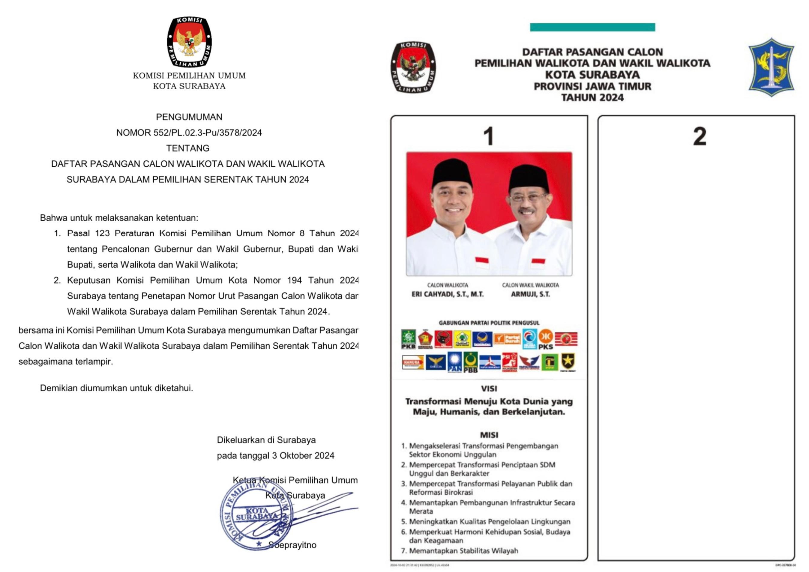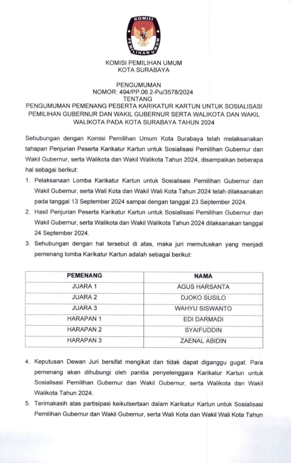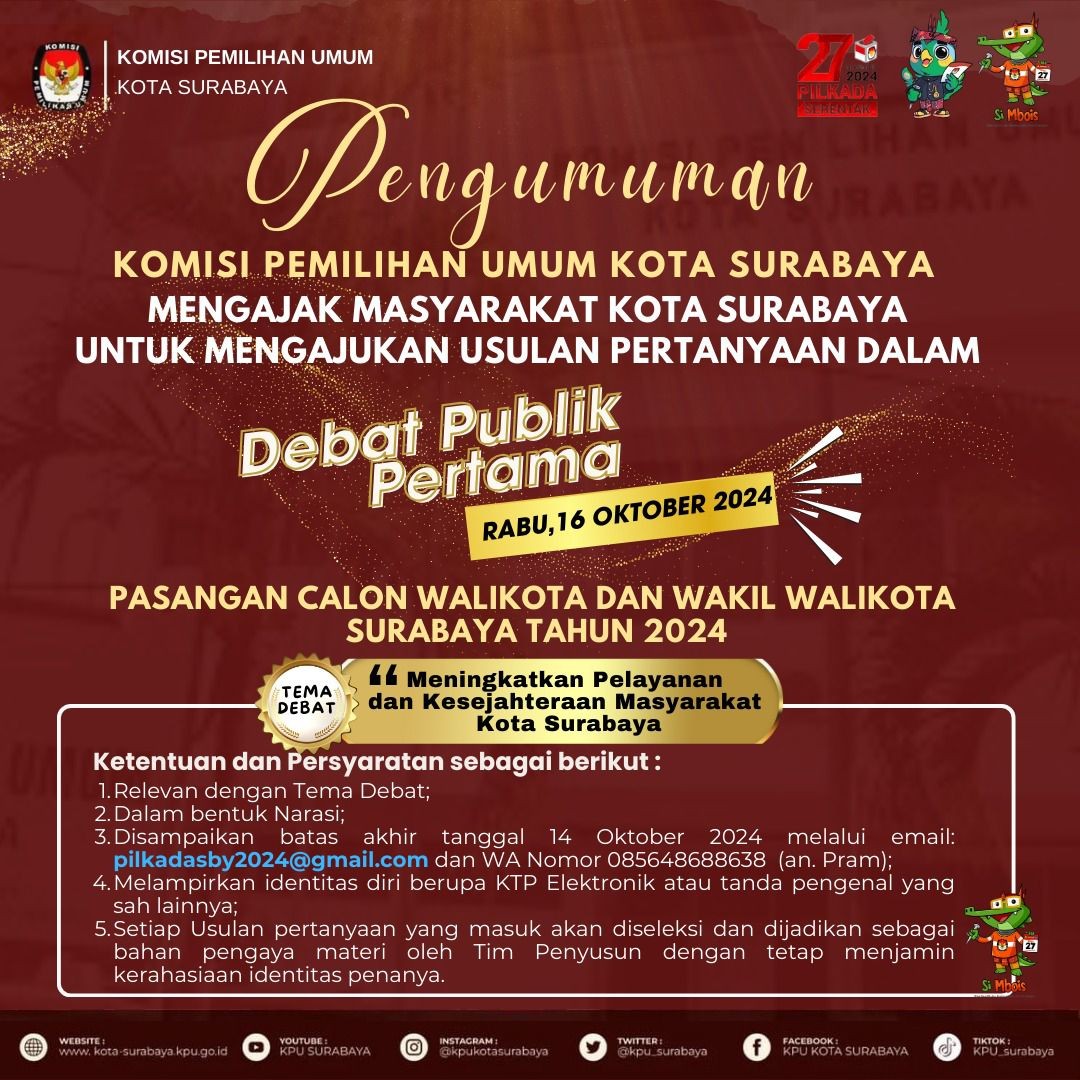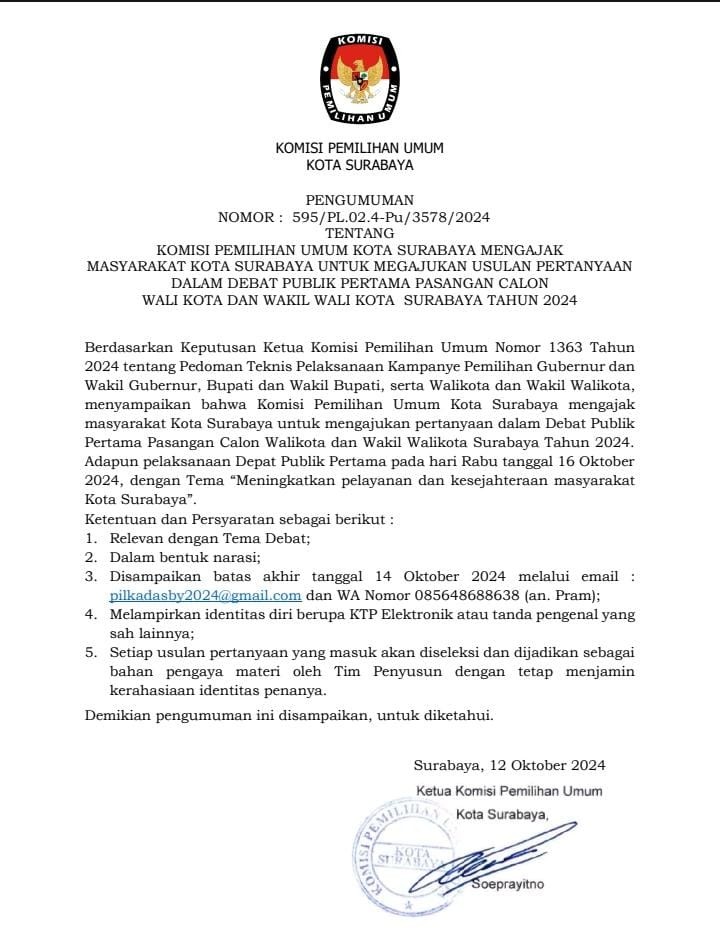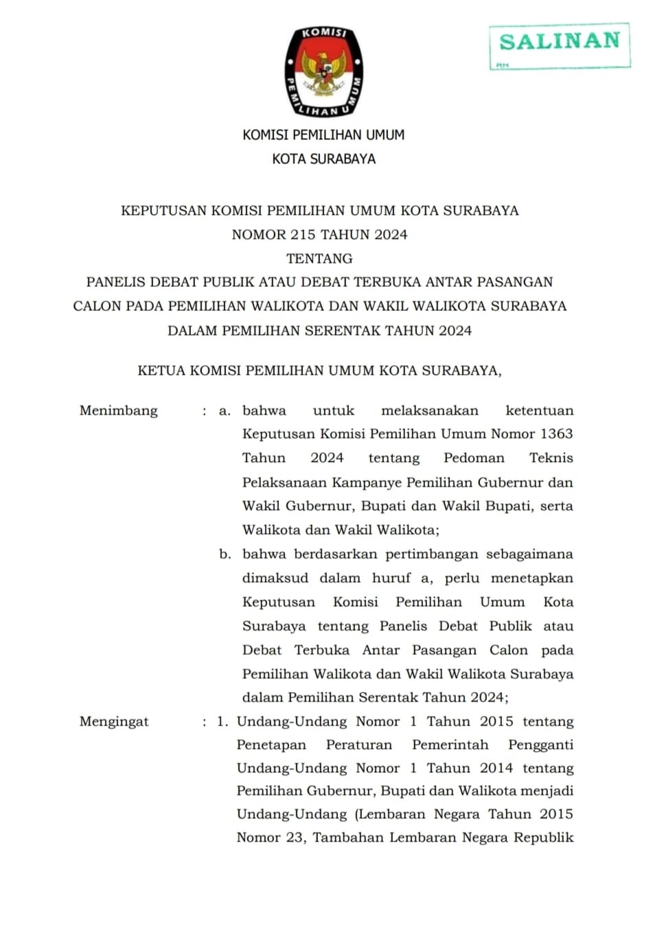 Keputusan Komisi Pemilihan Umum Kota Surabaya Nomor 215 Tahun 2024 Tentang Panelis Debay Publik Atau Debat Terbuka Antar Pasangan Calon Pada Pemilihan Walikota dan Wakil Walikota Surabaya Dalam Pemilihan Serentak Tahun 2024