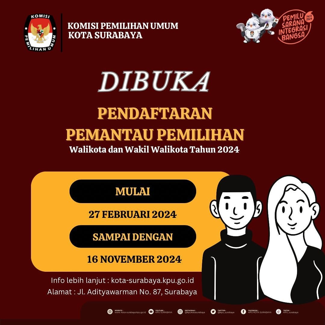 KPU Surabaya membuka Pendaftaran Pemantau Pemilihan Walikota dan Wakil Walikota Tahun 2024, selengkapnya form pendaftaran dapat diunduh di bit.ly/formpemantau_sub