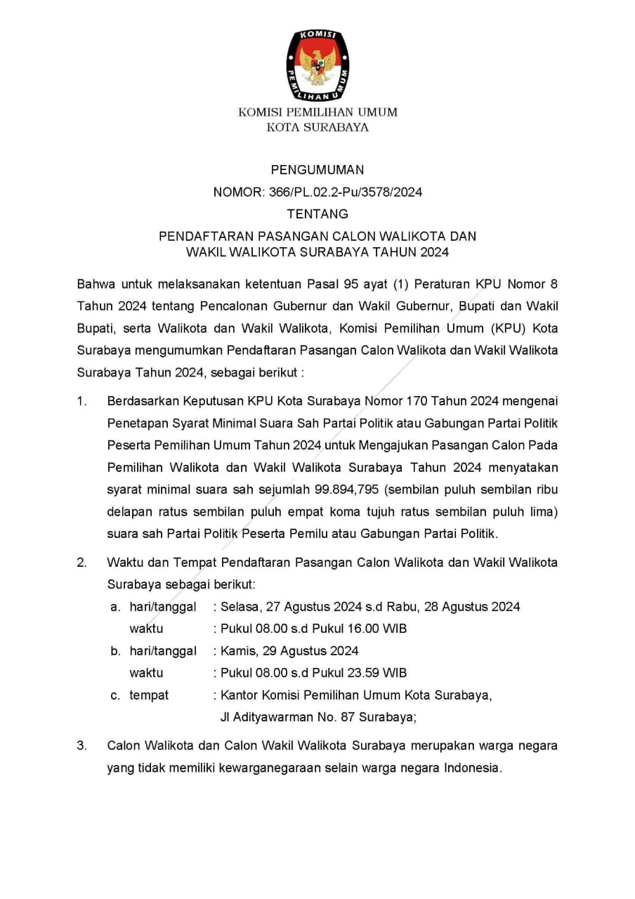 Berikut pengumuman Pendaftaran Pasangan Calon Walikota dan Wakil Walikota Surabaya Tahun 2024.