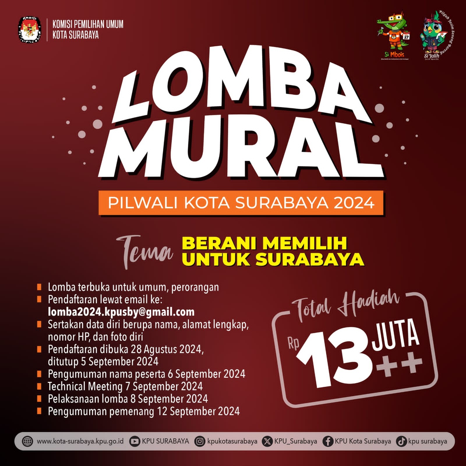 Hai #TemanPemilih KPU Kota Surabaya mengadakan Lomba Mural, pemilihan Walikota dan Wakil Walikota Surabaya 2024 dengan tema "BERANI MEMILIH UNTUK SURABAYA". Ayo daftar dan tunjukkan kreativitasmu.