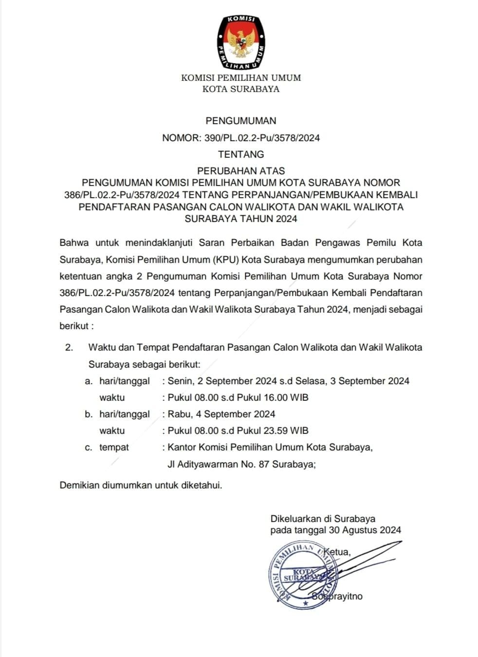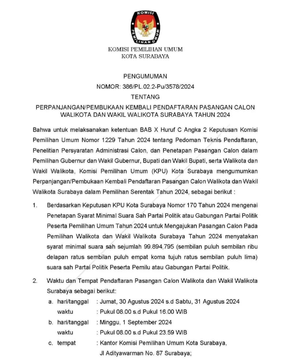 Berikut pengumuman Perpanjangan Pendaftaran Calon Walikota dan Wakil Walikota Surabaya Tahun 2024