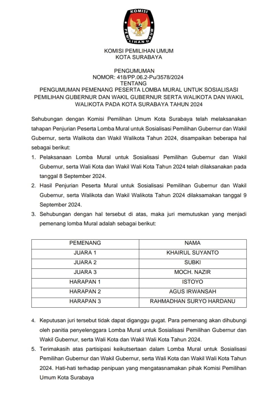 Berikut ini Pengumuman Pemenang Peserta Lomba Mural Untuk Sosialisasi Pemilihan Gubernur Dan Wakil Gubernur Serta Walikota Dan Wakil Walikota Pada Kota Surabaya Tahun 2024